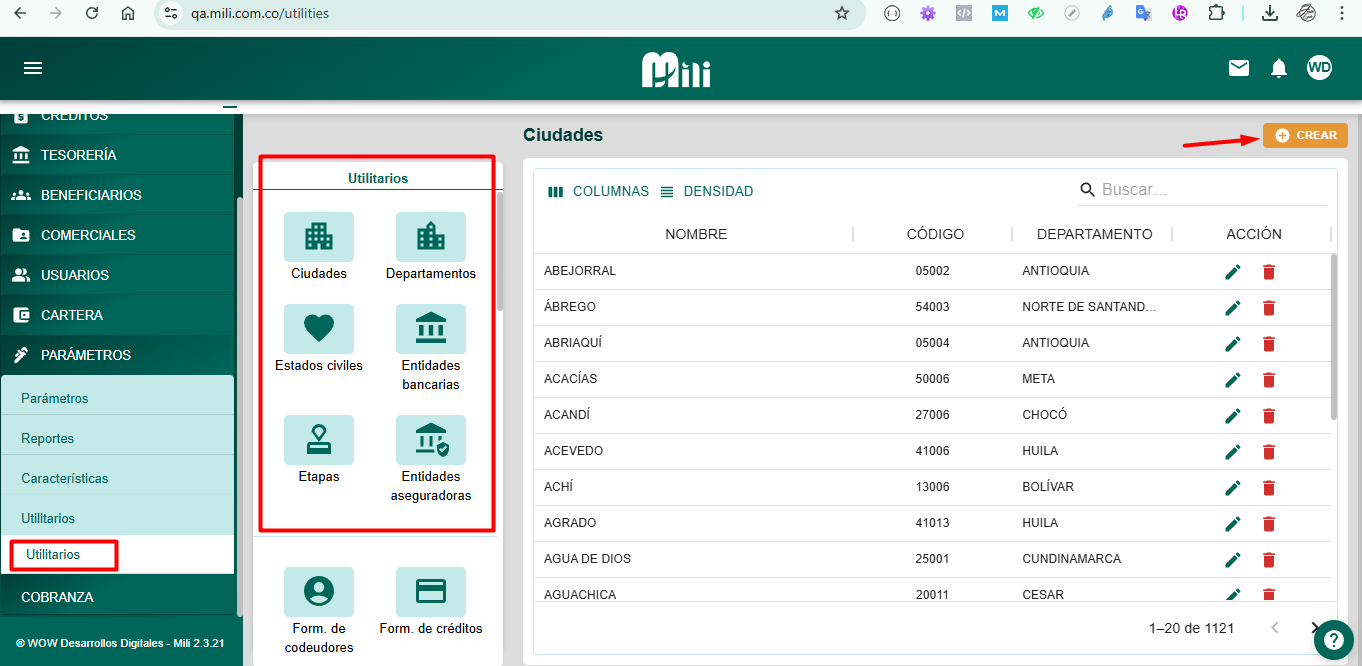 Desde este módulo se pueden crear, editar o inactivar registros en las siguientes categorías: